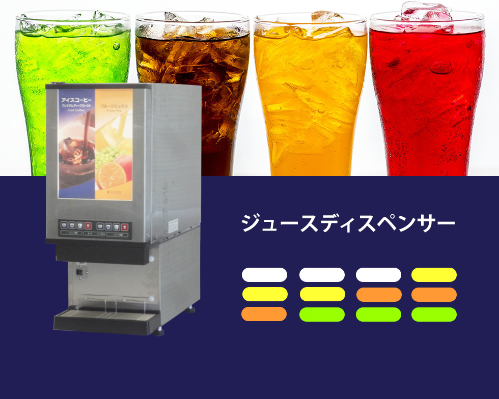 飲料メーカーでBIBに詰められた無炭酸濃縮飲料を冷水で希釈し、連続して飲料を提供できる業務用ジュースディスペンサーです。サイズもS、M、Lと選べ、フリードリンク(ドリンクバー)に最適なディスペンサーで、飲食店、ファミリーレストラン、厨房機器として幅広く活躍します。